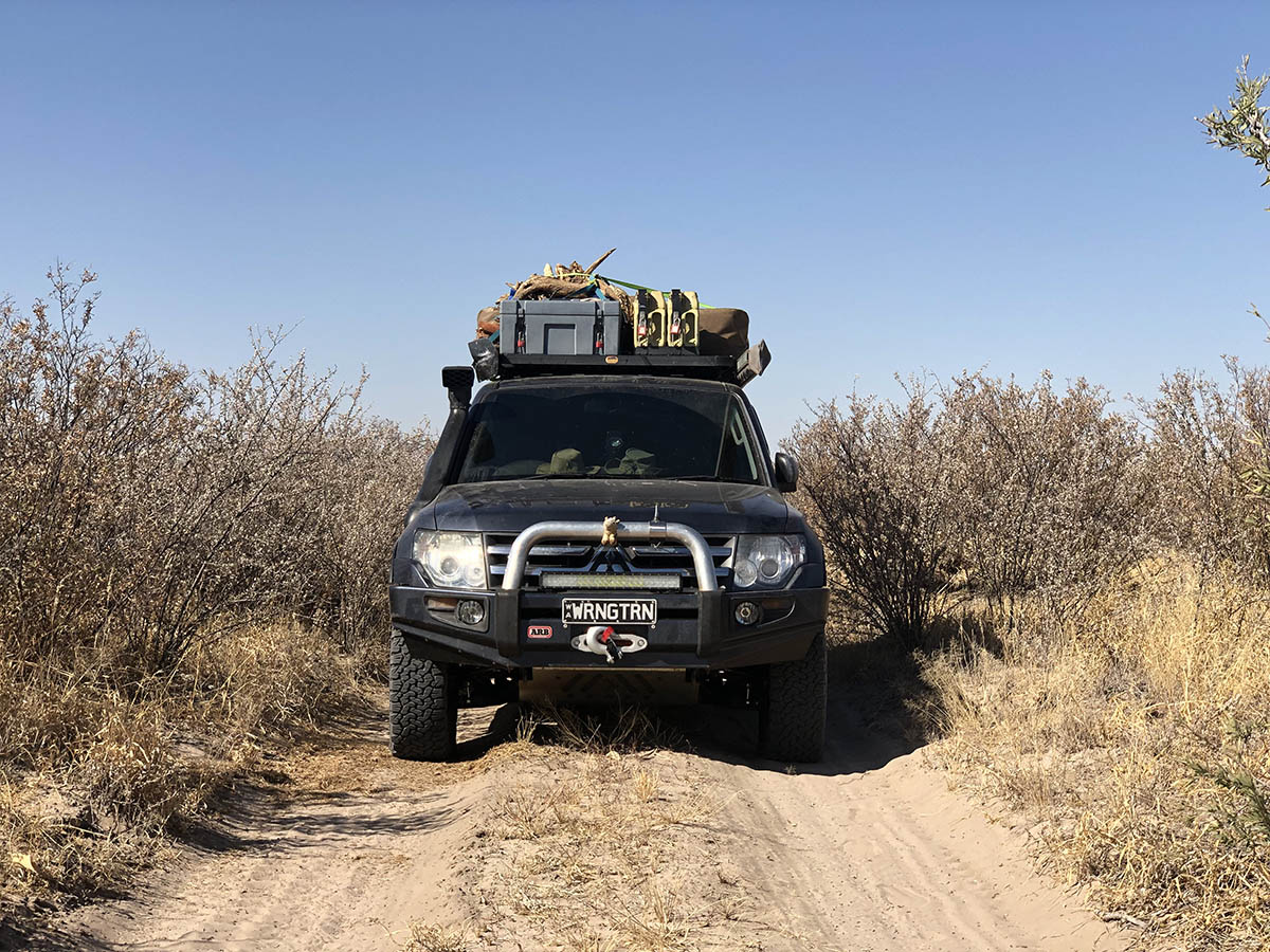 Waking up we sit and enjoy our coffee, Normally we are the lazy campers leaving at 10-11 but to day we have some serious miles to cover, and its soft soft sand. We get rolling and head further north, the sun climbs higher and higher and the sand gets softer and softer, I have let the tyres down to 9/12psi to help. We carry on with zero issues. We cross over the 300km mark and I switch to the sub tank. Zipping up to a waterhole for a quick peek, a see a few vultures and an old elephant skull. We drive up the hill near by and reheat last nights dinner for lunch. Good view point but I don’t see anything around.