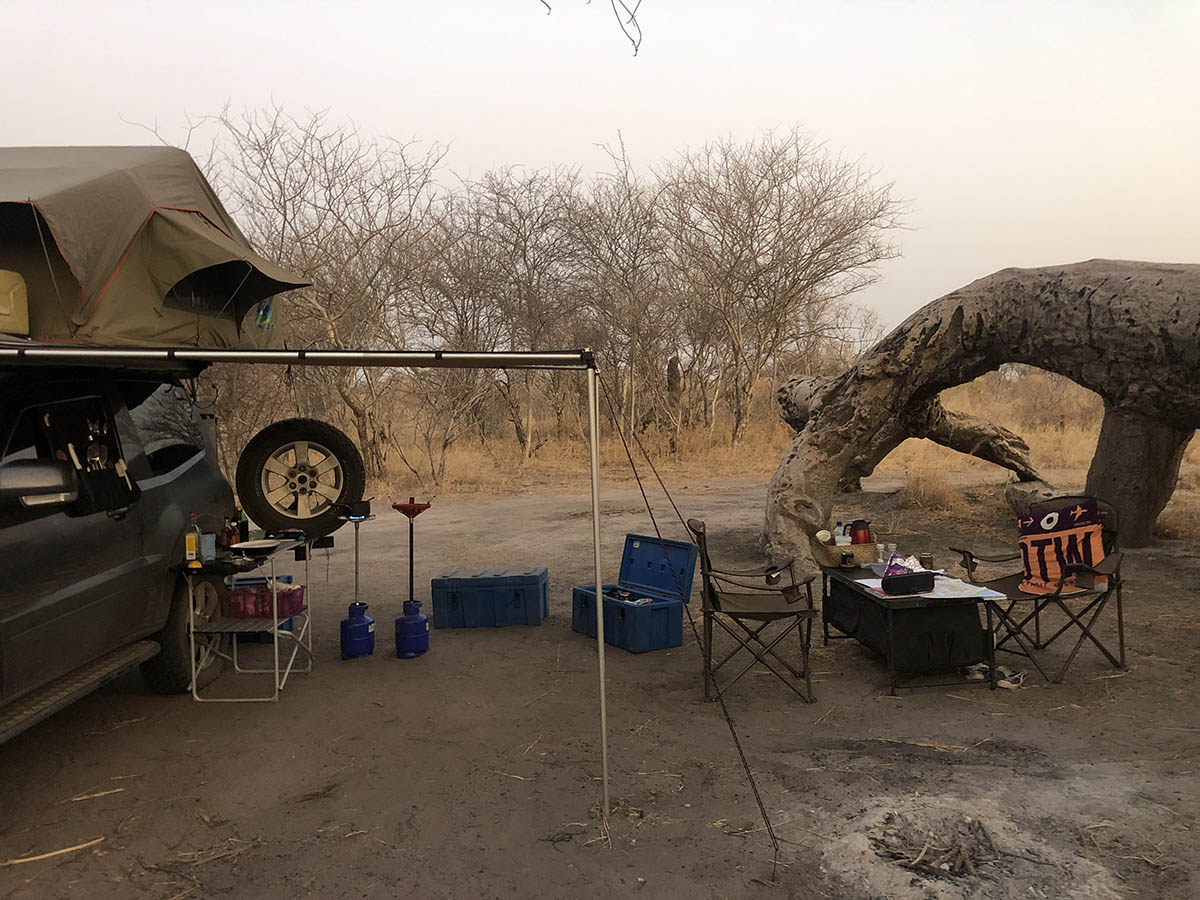 Moving on we stop at a different location for lunch, chicken sandwiches and savannah. The rangers are also out and about patrolling the area. The tourist buses start showing up on the radar now as we are almost at the exit, along with large groups of elephants. At the gate we check out and motor another 30kms to a baobab tree to camp around.