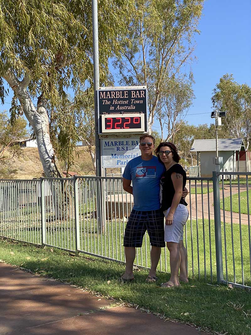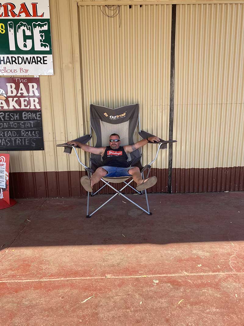 We waste not time getting moving in the morning before it gets hot, pulling along the main drag we stop and grab a snap shot in front of the hottest town in Australia, but not before hitting up the local shop for fresh bread, Asareh has prepared a great sandwich before we head out of town and Hutchy is testing out his new camping chair.