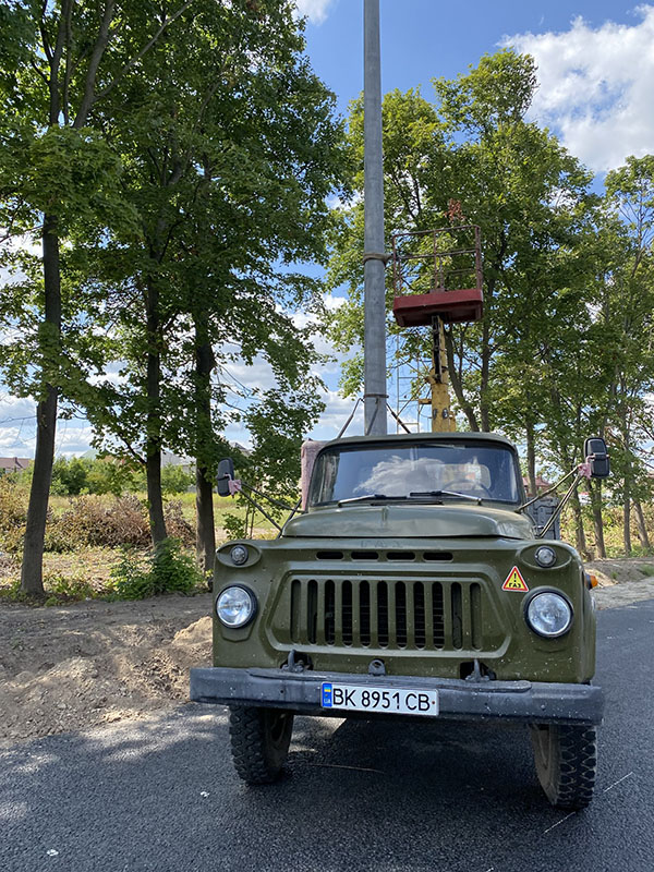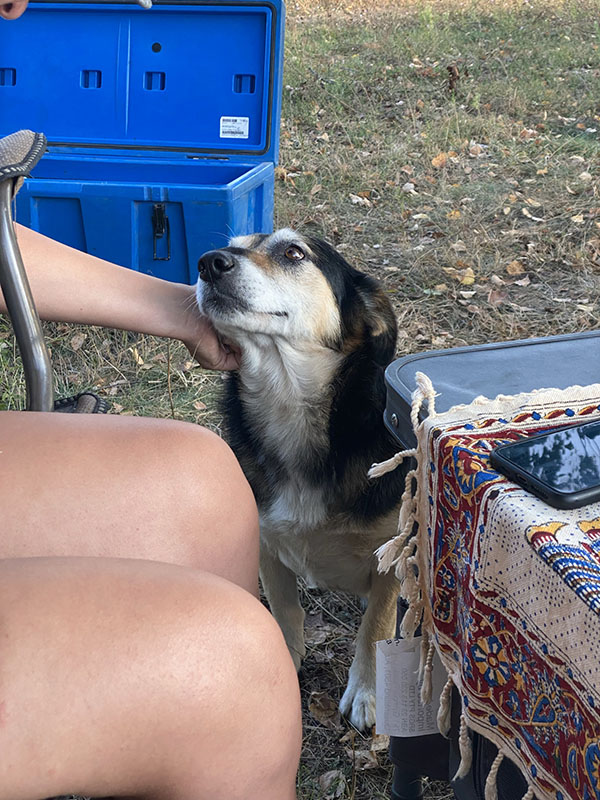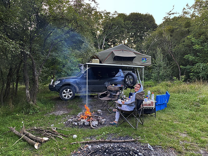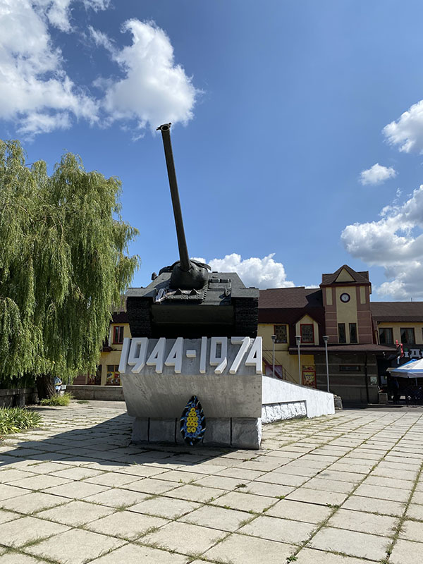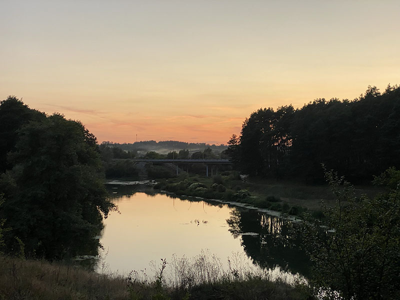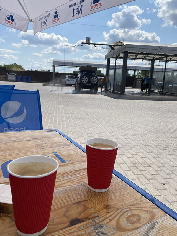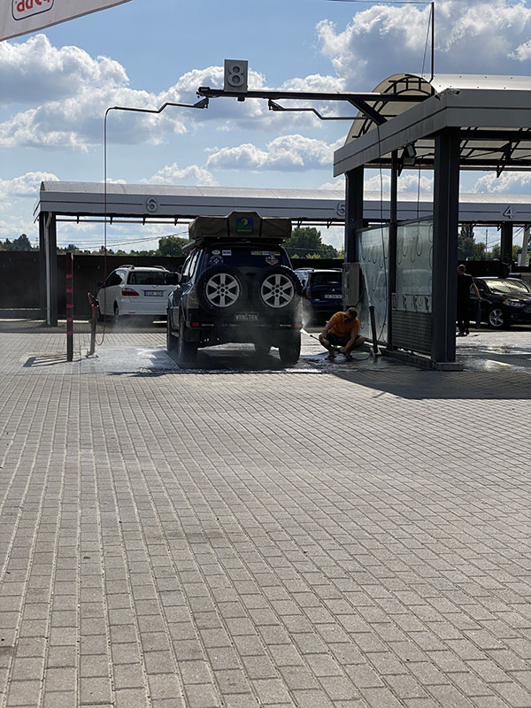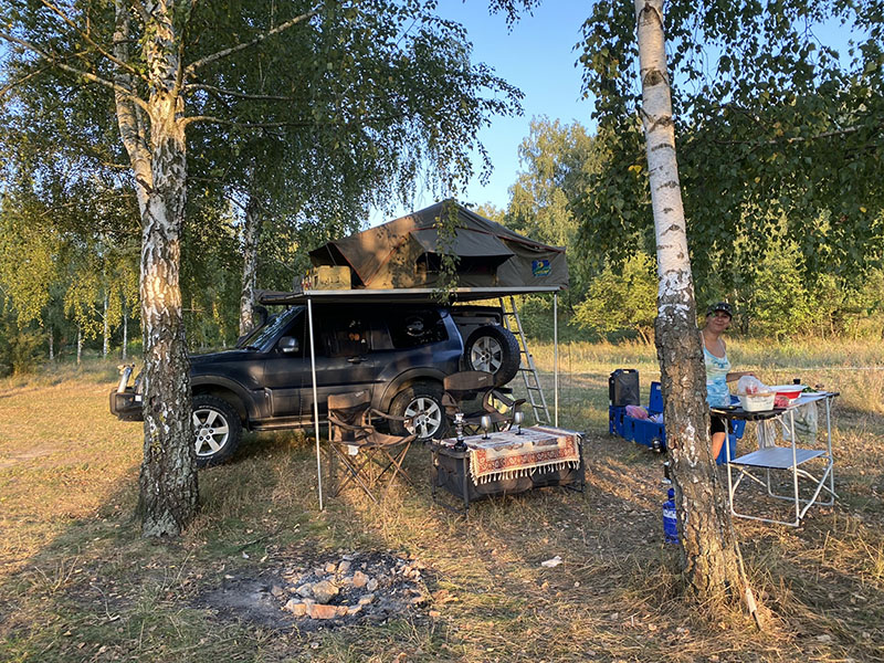 In the next town we fuel up, check out an old army tank and I give the wagon a quick was while Asareh enjoys a coffee. Our end goal of today is to get to Zhytomyr for the space museum. On arrival we find a nice river to park up on our of town where a Ukraine soldier approaches and has a small chat and is rather chuffed we have visited his city. And after he left, he return quickly with the Velcro army patch we now have on the headliner of our car. We spend the night with a dog that has visited for pets and have no problems at all camped near the city.