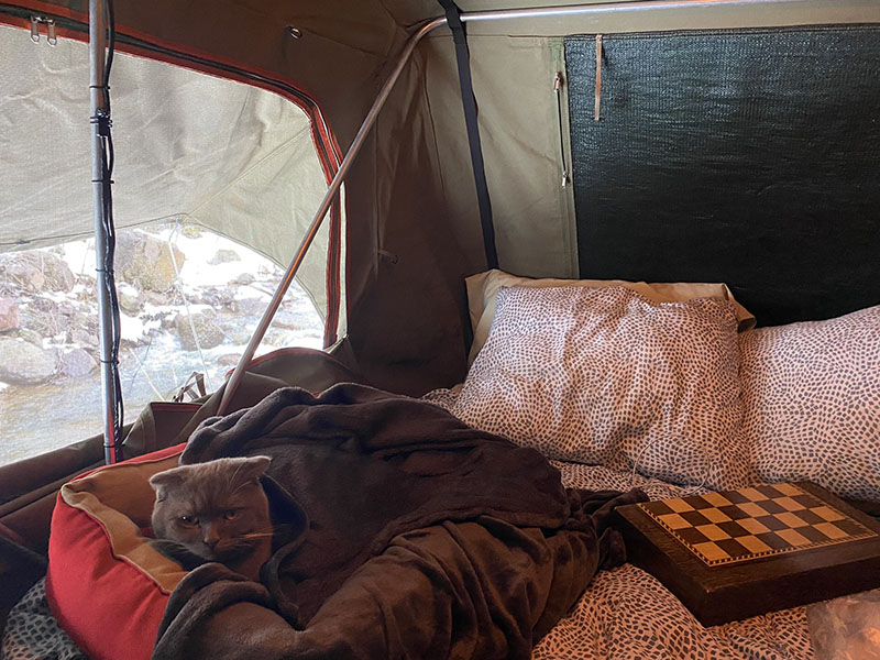 Nearing the valley floor, we find a nice little road that dead ends and pull in for the night. Tonight, is the first test of the heater in the tent and it is -5 out. It works! I will live another day. The cat loves it and we hang around outside having a glass of quite possible the worst wine I have ever bought to date. (I add to date, because you just never know) with everyone quickly shuffled into the tent we close it up and enjoy warmth. 10/10 recommend a heater for cold weather camping.