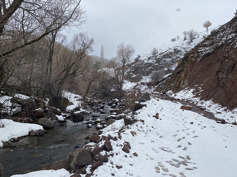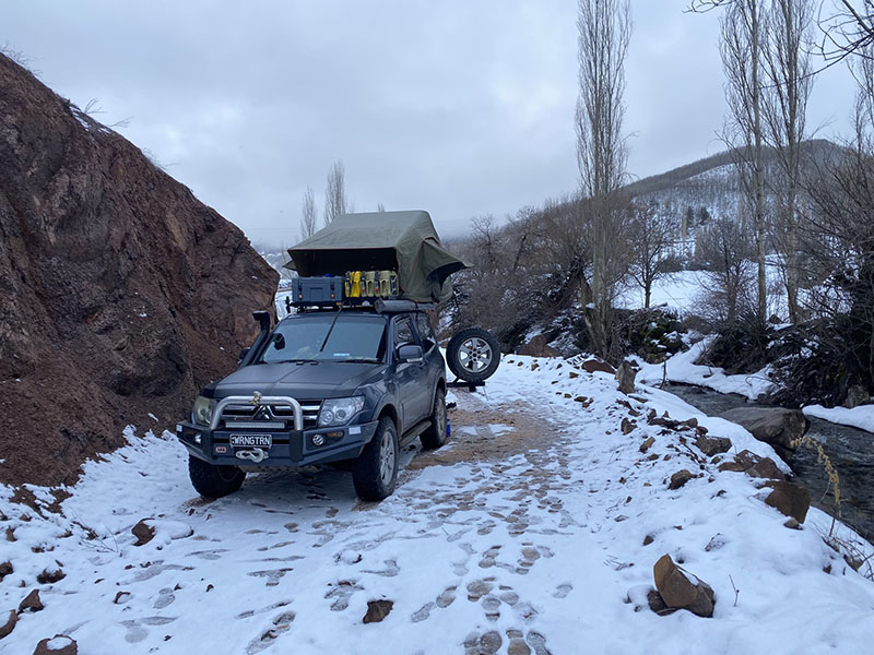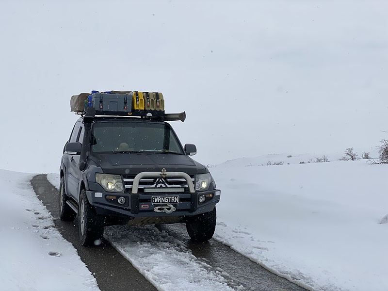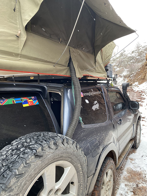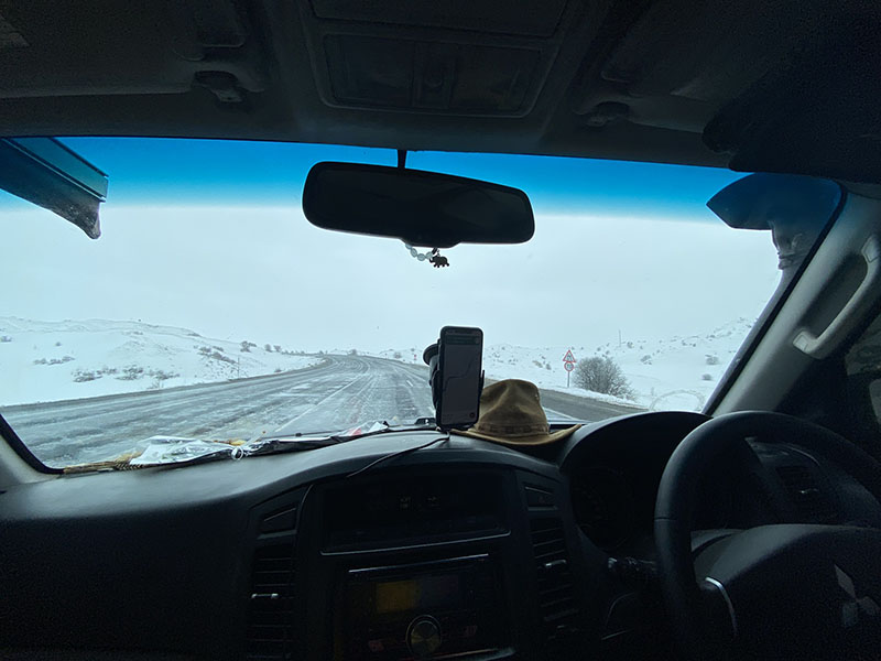 We spend most of the day on the highway until we get to Imranli, this is where we decide to head up over the mountain for camping as it looks good. We start pushing up the single lane road which has clearly been just opened up by the grader, which we also later ran into. We go up and up, there are no trees, the snow gets worse. We reach the summit and figure its best to continue on to see where we get. Although we do let the cat out to stretch his feet, he hates the leash, this leash gets changed soon enough and now we don’t even use a leash as there is no point.