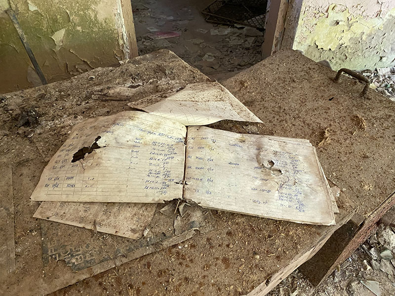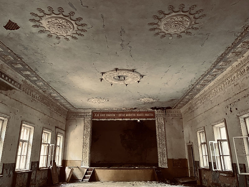 We cross the road and continue in the town, hitting up the town hall, which still boasts mottos from the soviet union above the stage. A car in front of a house lays being slowly taken back by the earth.