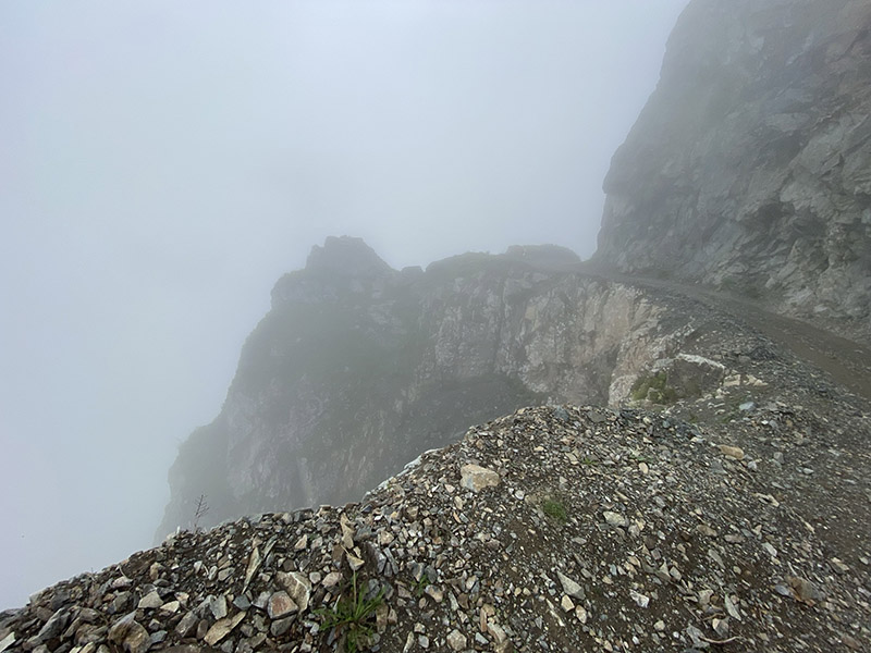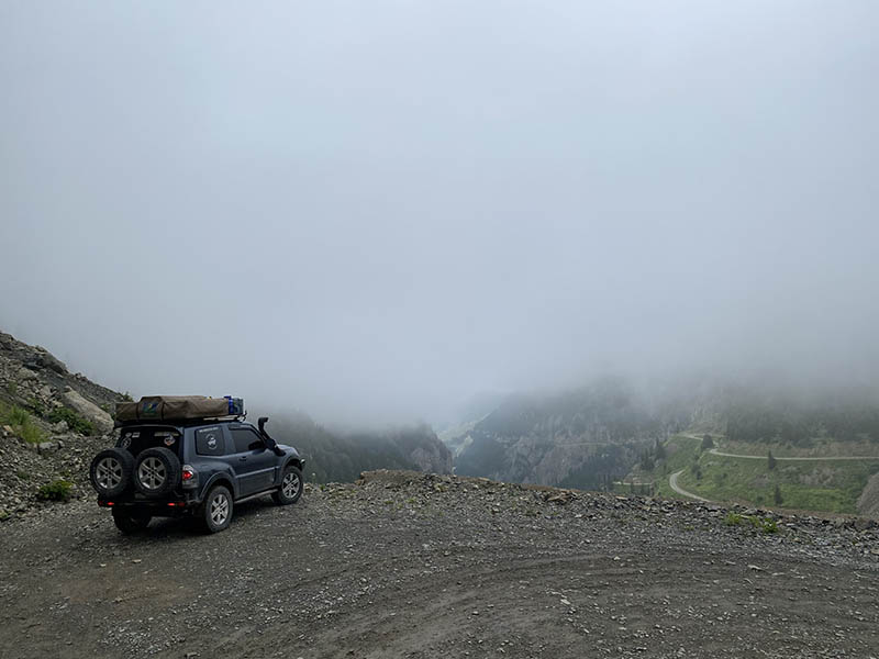 As we crest the pass we look down into the mist covered valley and begin our decent on the gravel track. Some areas are a bit tight, yet some wide enough to pass another car if so required. I do believe there was only 1 turn where I was required to do a 3 pointer, although maybe in a longer vehicle it could be an issue elsewhere.