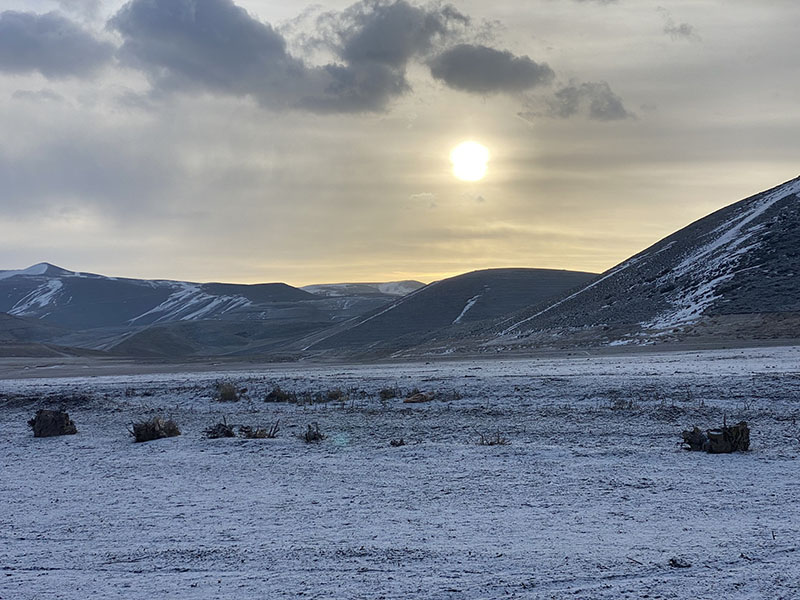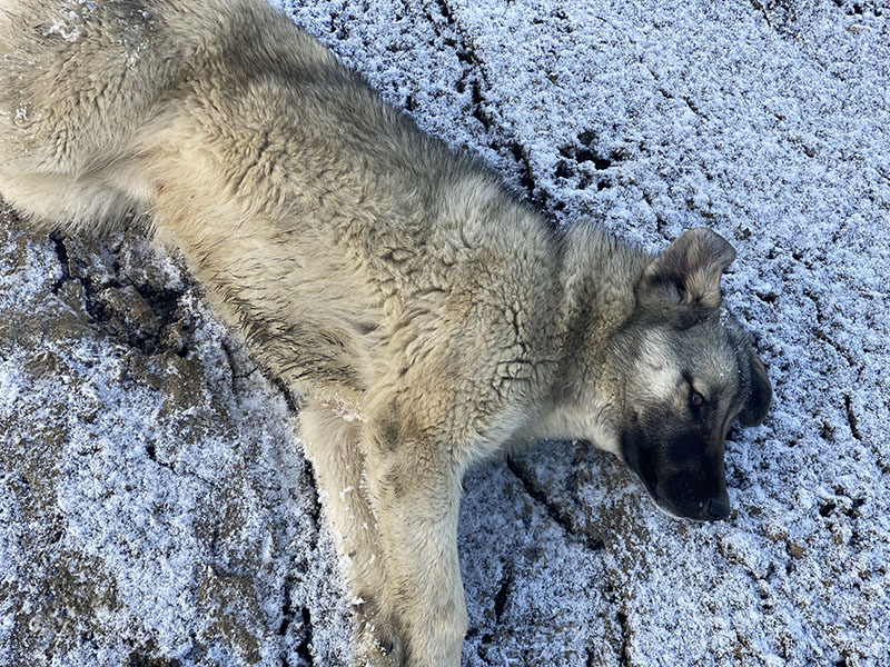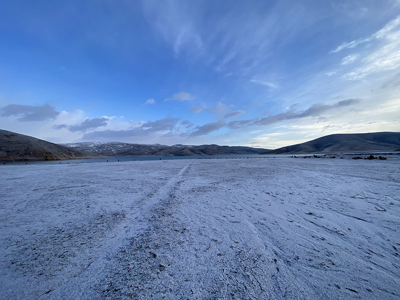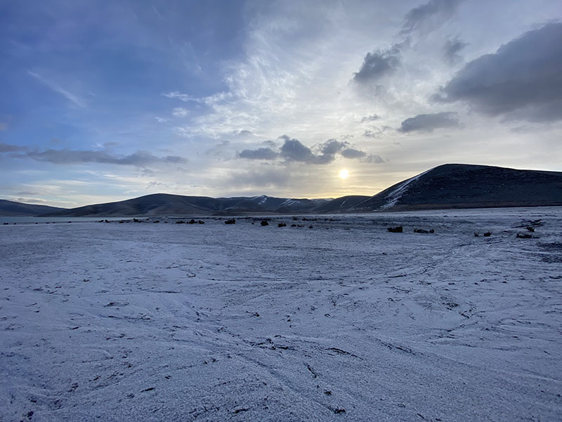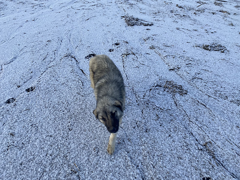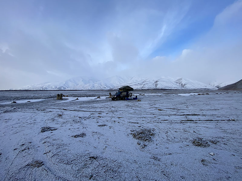 After arriving late at night in the dark we awake to a stunning view of mountains and the lake. There has been a light coating of snow while we slept as well, it seems to be following us with no signs of letting up, another issue being all the dogs from the previous night have stayed and we now have 7 sitting outside our tent, normally not an issue, except we a re worried about fleas for the cat. But they may have still got a little pet.
