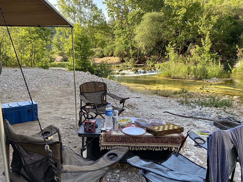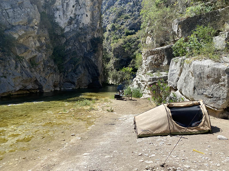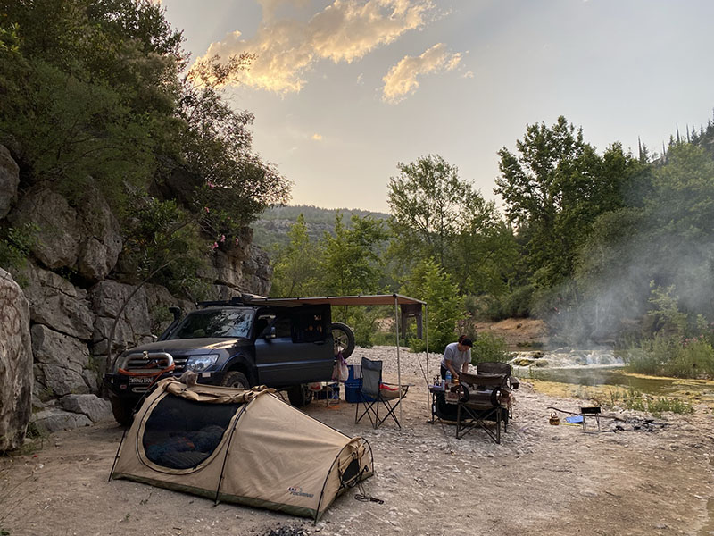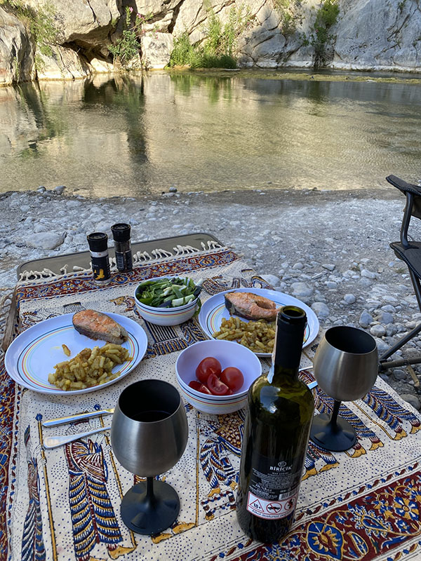 The next day we are greeted with 40c weather and straight sun, perfect weather for a dip in the water. A few locals join us as well, but leave early in the afternoon. We spend the night cooking some salmon which we enjoyed with a lovely glass of wine. The camping setup isn’t quite to spec, but we are living a good life.