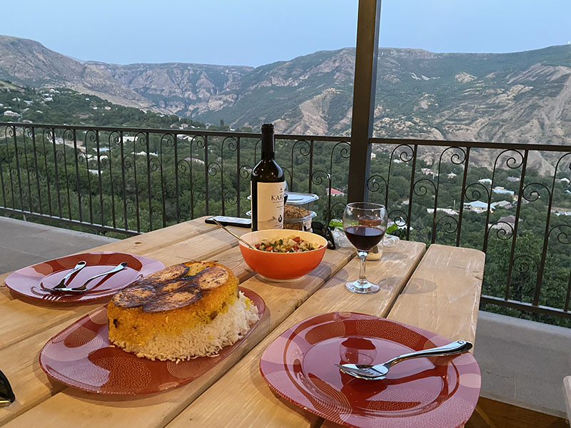 We decide to pull into the bush behind the church, after an ice cream of course, and park up to discuss our options. The decision is made to turn back, since it is a short drive to Yerevan and spend the next day hunting for parts in town. At least we had an amazing dinner back at the camp ground. And maybe a few wines…