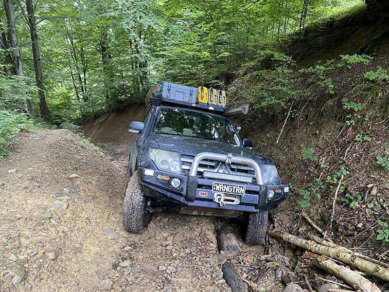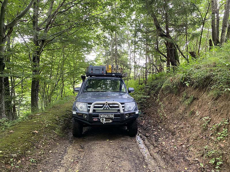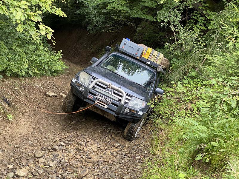 Now I pull out my mapping software and dig, even use google maps satellite view to aid, and I piece a track together that looks rough but doable. We start, the road gets smaller and smaller, then laps around a small house. I think this is the end, but we ask and are allowed to go through, and that’s where the fun begins. Right away we air down as its muddy, and its been raining. The trail is steep and a bit of camber, I don’t think we get more than 2kms down the track and the wagon is now straddling a washout as we go up a steep climb, I run out of room and the wagon slides into the ditch as we come around the corner and I lose all momentum. I try a little effort to see if it will budge, but we are high centered and to avoid breaking anything we decide its finally time to use our winch.
