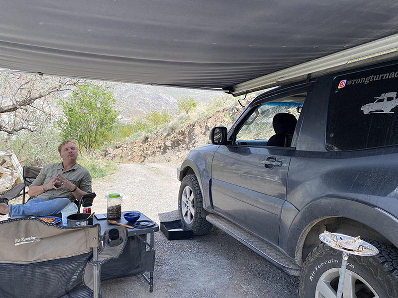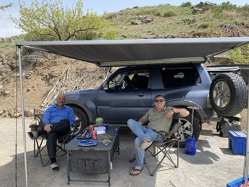 We stop in the next small town, Kivi Bala for supplies. With chicken and fresh veggies. Wait no, and a stock up of fake beer, which I am sure is worse for you than real beer, waist line wise. We go looking for a place to reheat dinner and chill. I pull up a small road and straight into a locals farm, he is more than happy to host us and allows us to stay for lunch, while Asareh cooks he shows me around. A great plot of land with a view over the whole city. We are even given some natural flowers to flavour our tea later that night.