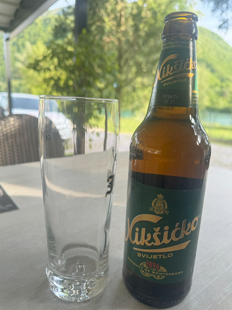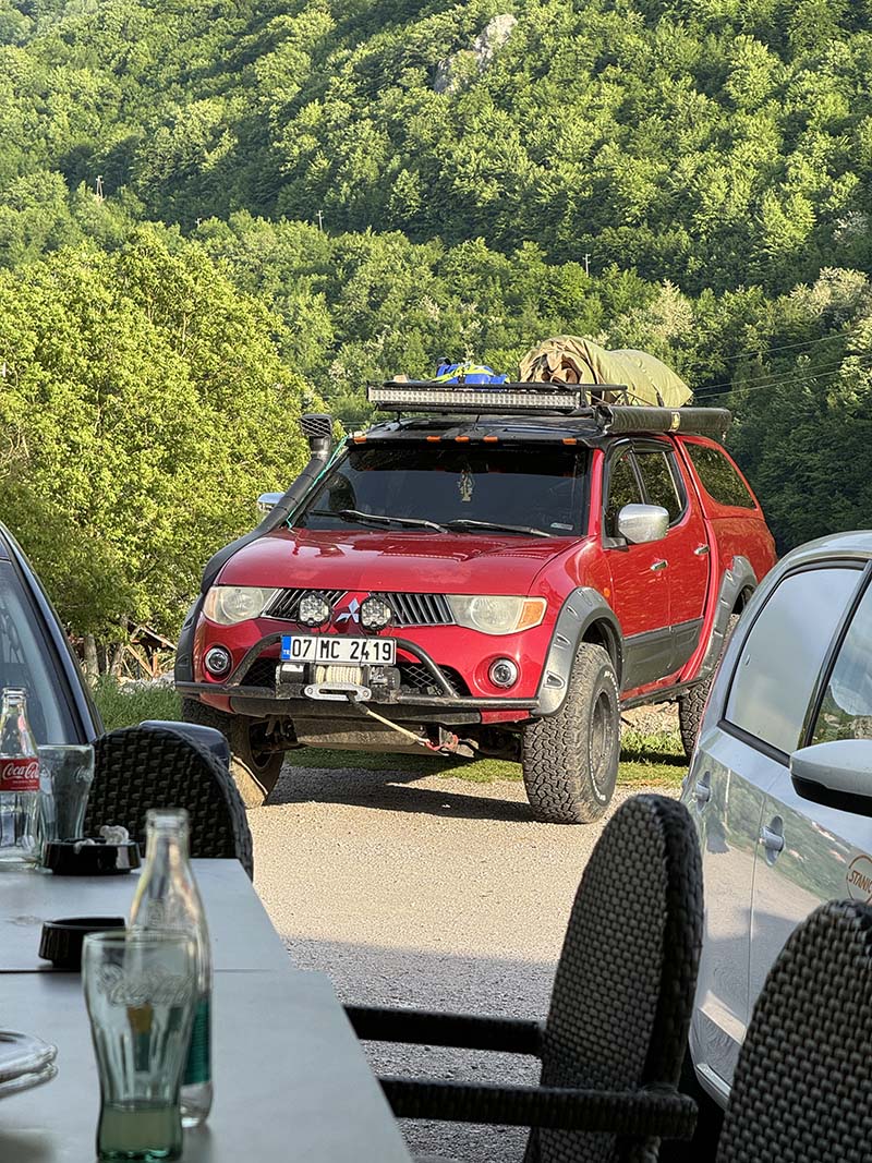 The river canyon is insane, huge walls, tunnels all over. With the sun still out its windows down and a slow cruise till we find our first pub. Time for a quick leg stretch before we finish our drive into Sarajevo.